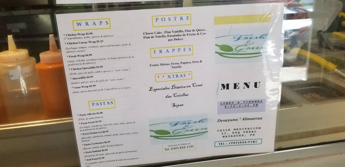 Welcome to Fresh & Green, a charming cafe nestled in Mayaguez, Puerto Rico. This delightful establishment is the go-to spot for those craving fresh, wholesome meals. The menu is a celebration of vibrant flavors, with an emphasis on healthy options that cater to all palates. From hearty breakfasts to crunchy, colorful salads, every dish is crafted with care.